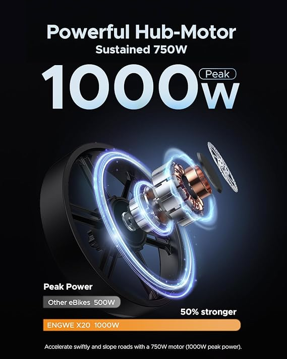 - 48V 14.4AH ENGWE Battery: Powered by 48V 14.4A removable Lithium single Battery and a powerful 1000W (peak) electric motor, this adult electric bike guarantees limitless exploration. Enjoy electric range of 40 miles in Throttle mode, allowing you to embark without worrying about power. With the PAS mode (Pedal assist mode), you'll be able to push your boundaries, reaching up to a remarkable 62 miles. Discover a new level of exhilaration and freedom with the ENGWE X20 E-bike.